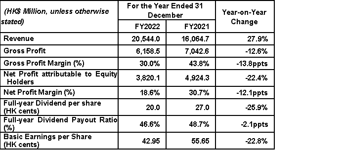 During FY2022, the Group achieved consolidated revenue of HK$20,544.0 million, representing an increase of 27.9% year-on-year (“YoY”). Gross profit stood at HK$6,158.5 million (FY2021: HK$7,042.6 million), with gross profit margin of 30.0% (FY2021: 43.8%). The decrease in gross profit margin was mainly due to the lower average selling price (“ASP”) and higher procurement costs of the solar glass segment, and a revenue reduction in the solar farm business resulting from the deduction of tariff adjustment (subsidy) receivables. Meanwhile, net profit reached HK$3,820.1 million (FY2021: HK$4,942.3 million). Basic earnings per share were 42.95 HK cents (FY2021:55.65 HK cents).